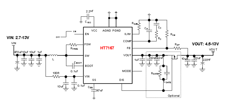 The HT7167 is a high-power density, fully integrated synchronous boost converter with a 16mΩ power switch and a 23mΩ rectifier switch to provide a high efficiency and small size solution in portable systems. The HT7167 has wide input voltage range from 2.7 V to 13 V to support applications with single cell and two cell Lithium batteries. The device has 12A switch current capability and can provide an output voltage up to 13V.