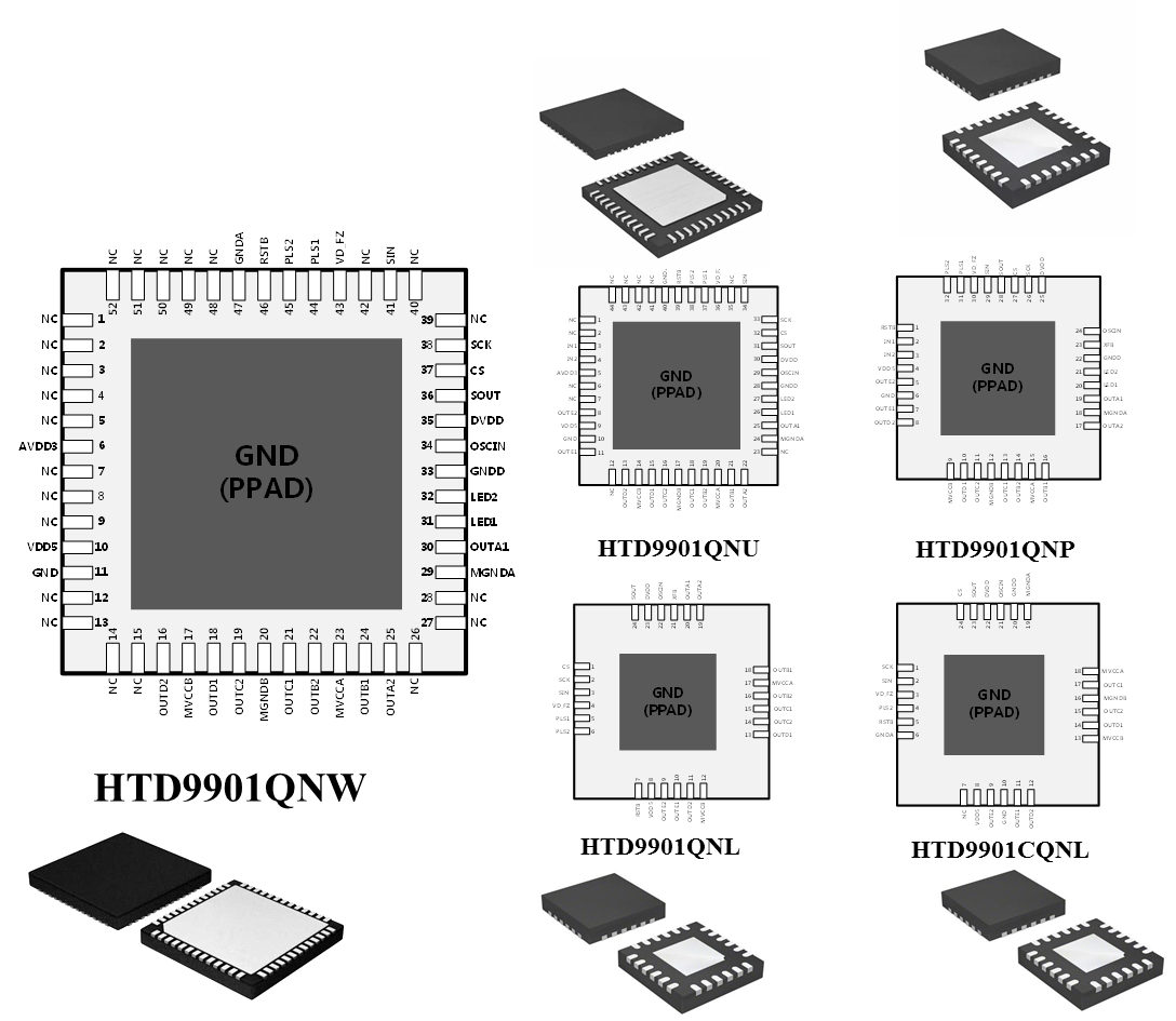 HTD9901提供帶有散熱焊盤(pán)的QFN52,QFN44,QFN32,QFN24封裝,無(wú)鉛產(chǎn)品,符合環(huán)保標準。