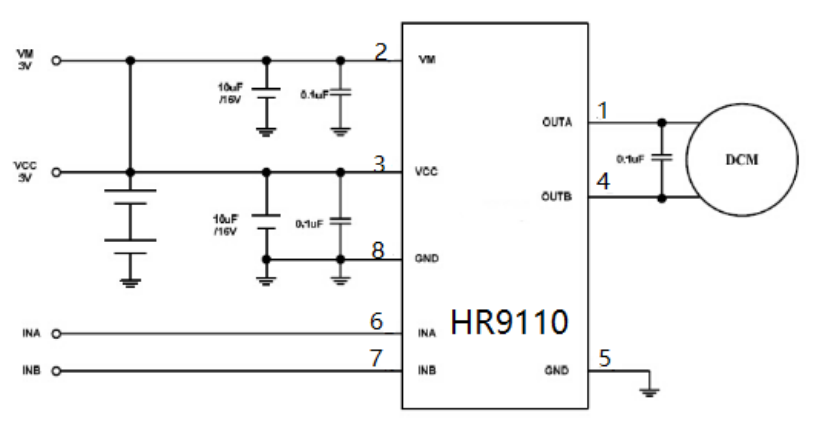 HR9110是應用于直流電機方案的單通道H橋驅動(dòng)器芯片。HR9110的H橋驅動(dòng)部分采用低導通電阻的PMOS和NMOS功率管。低導通電阻保證芯片低的功率損耗,使得芯片安全工作更長(cháng)時(shí)間。此外HR9110擁有低待機電流、低靜態(tài)工作電流。這些性能使HR9110易用于各種低壓直流電機驅動(dòng)方案。